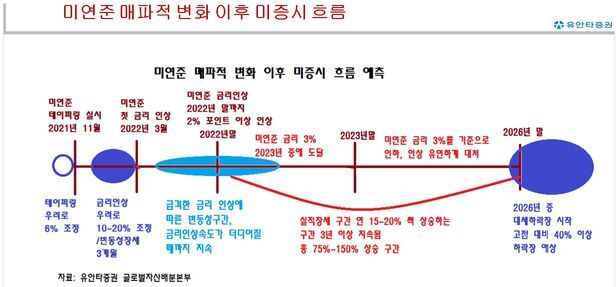 우선 인플레이션 가속화와 원자재 가격 상승의 영향을 점검했습니다. 제롬 파월 미 연준 의장의 5월 50bp(bp=0.01%포인트) 금리인상 언급과 연준의 6월 75bp 인상 확률 상승 등 매파적 움직임이 더욱 가속화된 상태입니다. 현재 1994년이나 1998년 수준의 빠른 금리인상 단행이 있을 수 있습니다. 하지만 그럼에도 불구하고 시장은 바로 대세하락장으로 가는 것이 아닌 상승 랠리 펼치다 하락할 것으로 김동관 연구원은 전망했습니다.
