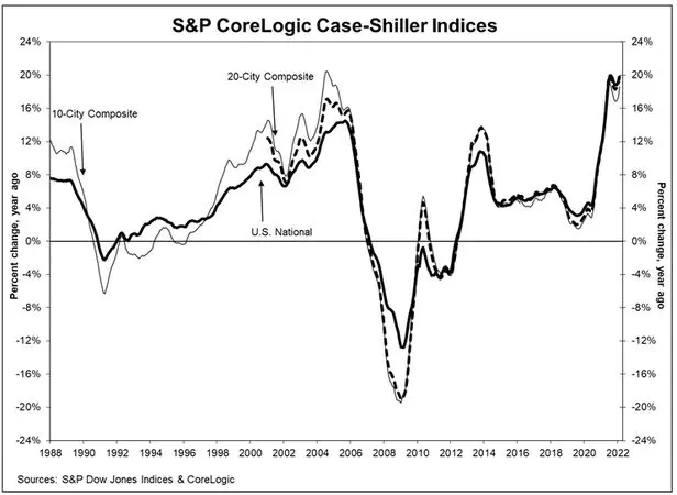이날 나온 S&P 코어로직 케이스-실러의 2월 전미 주택 가격 지수는 작년보다 19.8% 상승했습니다. 이는 1월의 상승률 19.1%보다 더 높은 수준입니다. 이 지표가 집계된 지난 35년 동안 세 번째로 가파른 수준의 상승률입니다.