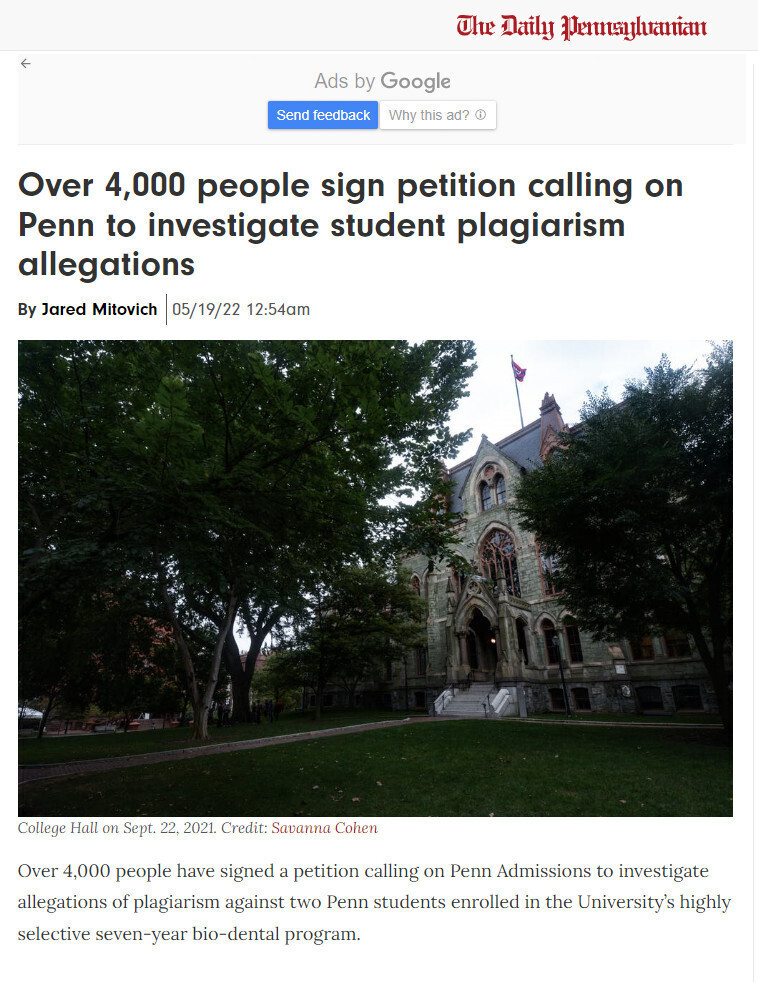 미국 펜실베이니아 대학(U-Penn)의 학교신문인 <더 데일리 펜실베이니안>은 19일 “유펜이 학생들의 표절 혐의를 조사하라고 요구하는 청원에4000명 이상이 서명했다”는 기사를 보도했다. 더 데일리 펜실베이니안 갈무리