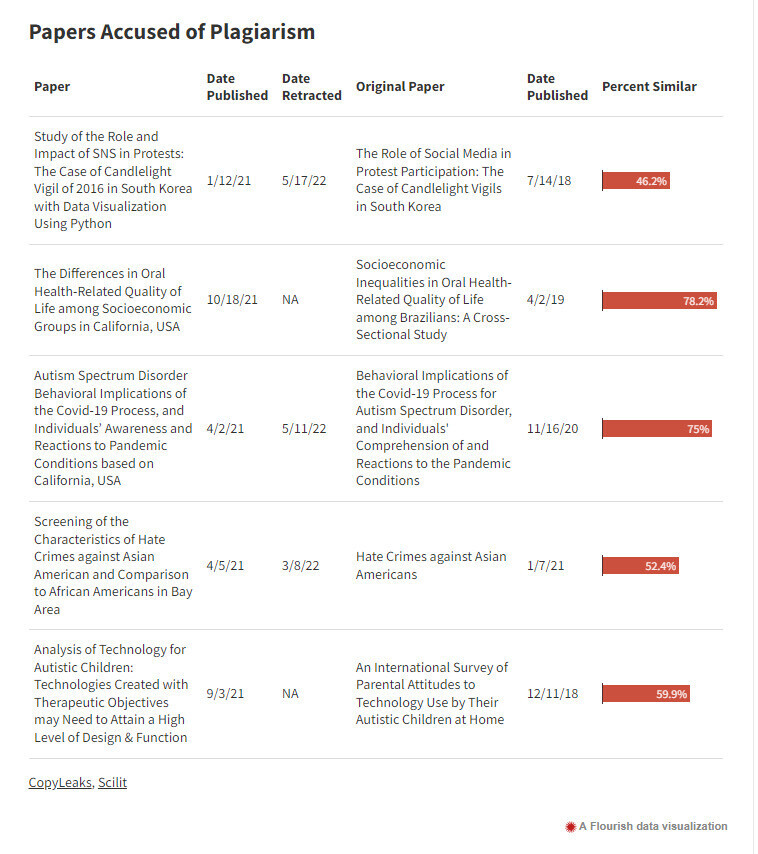 그는 “최근 어떤 단체에서 내 논문이 미주 한인 고등학생들에 의해 심각하게 표절되었다고 연락이 왔다”며 “표절을 어느 정도 심각하게 했는지 궁금한 마음에 한번 그 친구들의 논문을 열어봤다. 나는 ‘몇 문장 베끼고 짜깁기 했겠지’라고 생각했는데 그냥 통째로 다 베낀 수준”이었다고 적었다. 이어 “방법론 파트는 더 가관이었다. 측정 변인들도 거의 같고 심지어 몇몇 변인들은 통계치가 소수점 두 자리까지 같았다”며 “데이터가 완전히 다른데 통계치가 똑같다? (샘플 사이즈 차이도 아주 크다) 사실상 불가능에 가깝다”고 했다. 직접 데이터를 수집해 연구를 수행했는지 의심이 든다는 취지다.