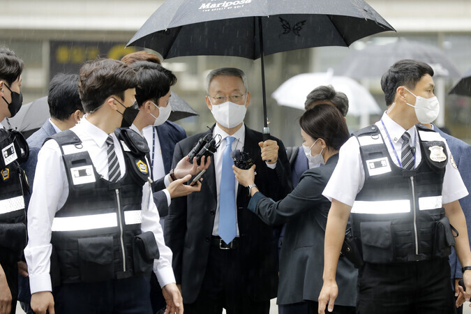 백운규 전 산업통상자원부 장관이 15일 오전 서울 송파구 문정동 서울동부지법에 구속 전 영장실질심사를 받기 위해 들어가면서 기자들의 질문을 받고 있다. 김명진 기자 littleprince@hani.co.kr