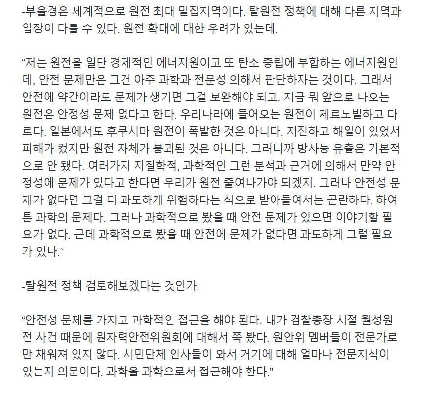 윤 전 총장은 또 “탈원전 정책 (재)검토를 하겠다는 것이냐”는 <부산일보> 기자 질문에 “안전성 문제를 가지고 과학적인 접근을 해야 된다. 내가 검찰총장 시절 월성원전 사건 때문에 원자력안전위원회에 대해 봤다. 원안위 멤버들이 전문가로만 채워져있지 않다. 시민단체 인사들이 와서 거기에 대해 얼마나 전문지식이 있는지 의문이다. 과학을 과학으로서 접근해야 한다”고 말했다.