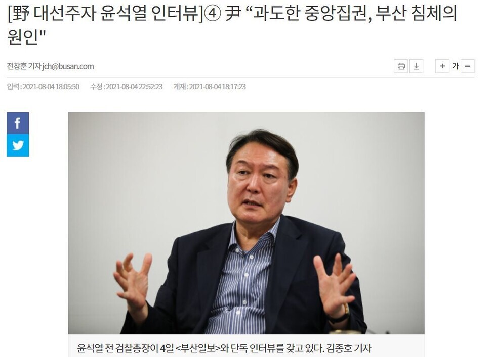 <부산일보> 인터뷰 발언 파장…윤 전 총장 쪽 요청 해당 발언 삭제