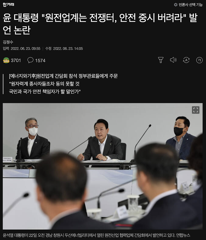 대선 출마 선언에서도 문재인 정부 탈원전 정책을 비판했던 윤 전 총장은, 이후 원자력 학계 인사와 학생들을 만난 자리에서도 후쿠시마 원전 사고를 언급하며 원전 옹호 발언을 한 바 있다.