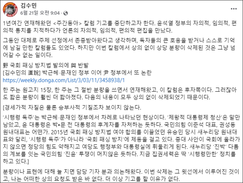 기고자인 시사평론가 김수민씨는 “윤석열 정부의 자의적, 임의적, 편의적 통치를 지적하다가 언론의 자의적, 임의적, 편의적 편집을 만났다”면서 “1년여간 연재해왔던 주간동아 칼럼 기고를 중단한다”고 선언했다.