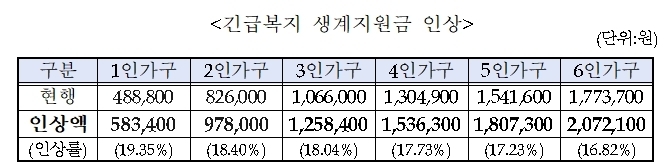 [세종=뉴시스]보건복지부(복지부)는 7월1일부터 긴급복지 생계지원금 단가를 인상한다고 22일 밝혔다. 가구 규모별로 인상율과 단가가 상이하다. (자료=복지부 제공) 2022.06.22. photo@newsis.com *재판매 및 DB 금지