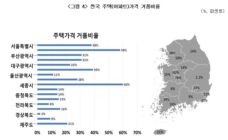 - 주택가격 거품 수준, 서울 38%, 경기 58%로 극단적 버블 현상 관찰