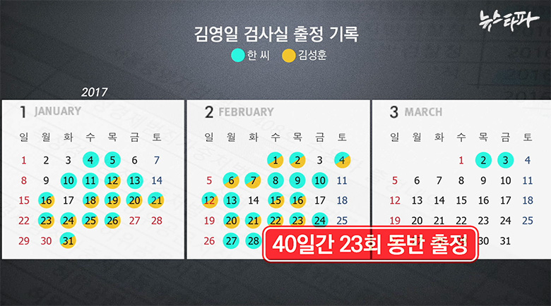 브로커 죄수 한 씨와 김성훈의 김영일 검사실 2017년 출정 기록. 처음에는 한 씨 혼자 출정을 다니다 1월 12일 이후 김성훈과 동반 출정을 23회 나갔다.