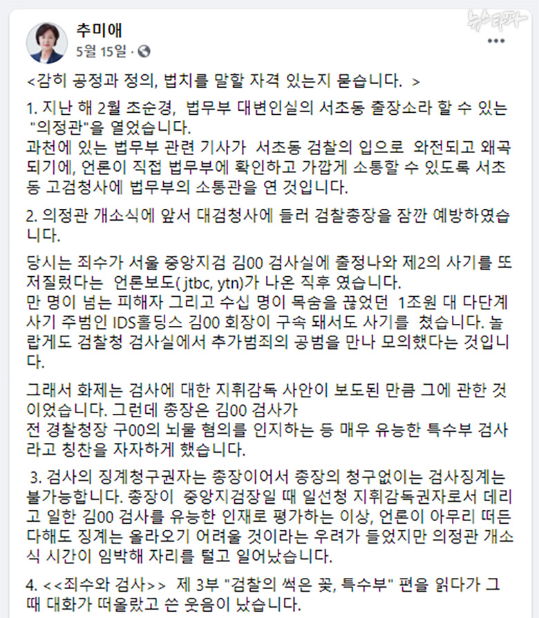 추미애 전 법무부 장관이 책 <죄수와 검사>를 읽고 작성한 페이스북 게시글