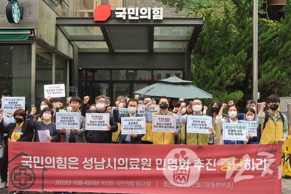 좋은공공병원만들기운동본부(이하 본부)는 오늘(4일) 여의도 국민의힘 당사 앞에서 기자회견을 열고 “윤석열 대통령과 국민의힘 지자체장들의 의지에 따라 성남뿐아니라 대구, 경북, 충남 등 여러 지자체에서 공공병원 위탁이 시도되고 있다”며 “민간위탁은 의료원의 공공성을 훼손하는 공공병원의 민영화”라고 강력 규탄했다.
