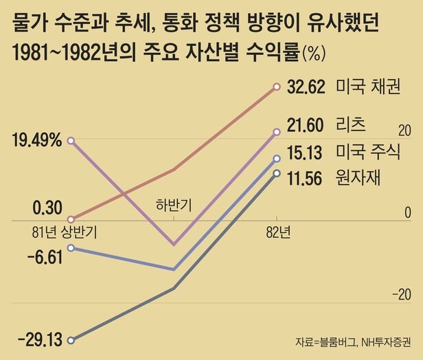 1981년 사례를 대입하면 내년 상반기 채권부터 수익률을 서서히 회복하고, 주식은 2024년 초쯤 돼서야 반등한다는 계산이 나온다. NH투자증권 하재석 연구원은 “내년 상반기까지 높아진 금리 수준(채권 가격 하락)으로 인해 매력이 커진 한·미 국채 비중을 확대하는 전략이 유효하다”며 “다만 인플레이션 불확실성이 높아지면 채권의 인플레이션 헤지(위험 회피) 능력이 취약해진다는 점은 유의해야 한다”고 말했다.