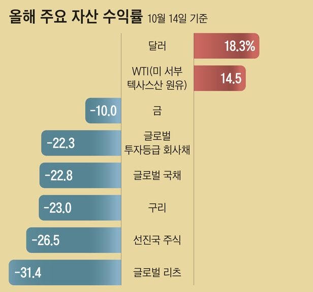 보통 경기 하강 우려가 커지고 시장 변동성이 높아지면 안전자산인 금이나 국채에 자금이 몰리며 가격이 상승하는 경향이 있다. 하지만 올해는 금리가 순식간에 너무 빨리 오르다 보니 되레 금과 국채의 단점이 부각됐다. 금은 금리 인상기에 이자도 배당도 받을 수 없다는 점 때문에, 국채는 고정된 표면금리가 시장 금리 대비 너무 낮다는 점 때문에 인기가 시들해졌다. 결국 일부 원자재를 제외하고 살아남은 자산은 달러(수익률 18.3%)가 유일할 정도다. 미국 블룸버그는 현 상황에 대해 “주식·채권 중심의 전통적 자산배분 전략이 무너진 총체적 난국”이라고 평가했다.
