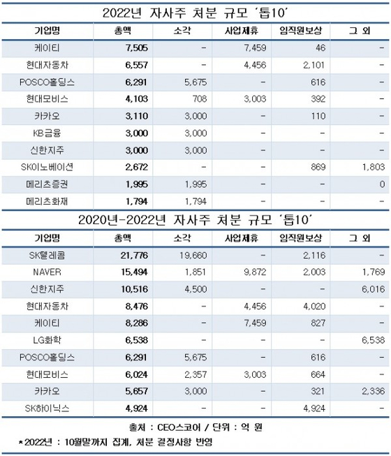 자사주 처분 규모는 2020년 4조796억원에서 2021년 4조5230억원, 올해 1~10월 5조1191억원으로 늘었습니다.