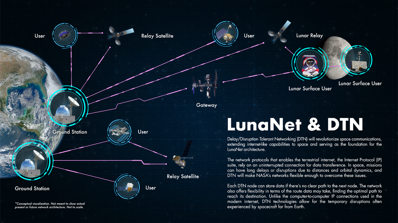 NASA에서 아르테미스 미션을 위해 개발한 통신 네트워크 ‘루나넷(LunaNet)’도 DTN 우주인터넷을 채택하고 있다. NASA는 달 궤도 우주정거장 ‘루나 게이트웨이’를 만들어 달과 지구의 통신중계(루나넷)와 우주인 단기 거주계획을 수행할 예정이다. 지구 어디서나 이용 가능한 스마트폰의 기지국처럼, 루나 게이트웨이가 행성 간 통신망의 기지국 역할을 맡을 계획이다.