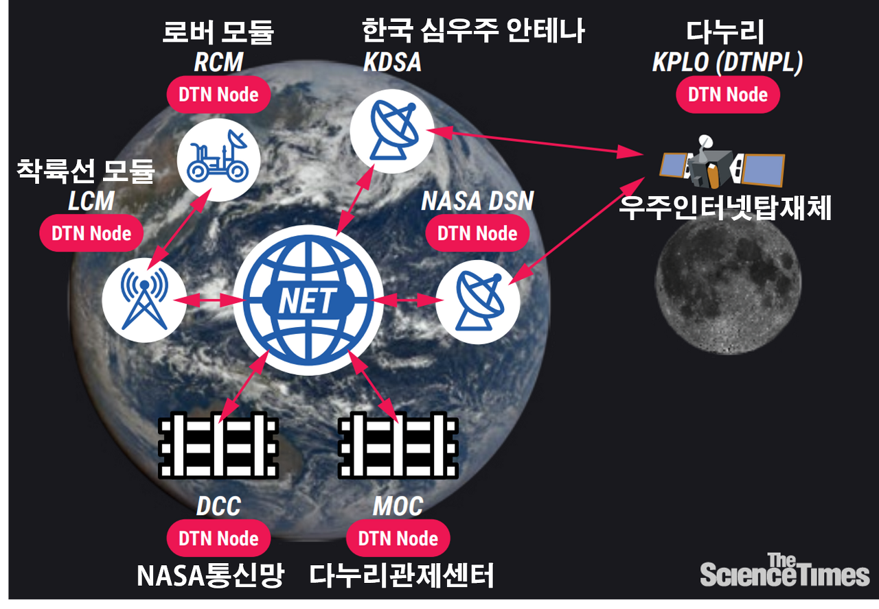 다누리에서 보내온 데이터 또한 NASA와 항우연의 중계노드를 거쳐 ETRI 우주인터넷 통신센터로 연결된다. 현재 지구상에 존재하는 우주인터넷 노드로는 심우주지상안테나(Korean Deep Space Antenna, KDSA)에 연결된 항우연 관제센터, ETRI 우주인터넷 통신센터를 비롯해 착륙선 통신모듈, 로버 통신모듈, 미국 NASA의 심우주통신망노드 등이 있다.