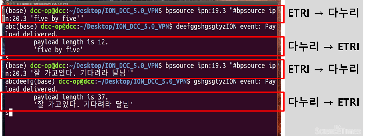 다누리와 지구(ETRI)가 우주인터넷 통신으로 메시지를 주고받은 모습이다. ‘five by five’와 ‘잘 가고 있다. 기다려라 달님’을 송수신했다. ©과학기술정보통신부 제공