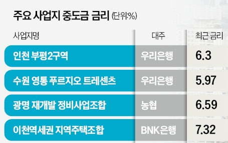 "이틀 만에 이게 말이 됩니까"…아파트 분양 받았다가 '쇼크', 중도금 금리가 7%…낼 때마다 '화들짝' 내년 분양시장 '고금리 뇌관' 부평2구역·영통 푸르지오 등 조합-은행간 '대출 금리' 갈등 1차
