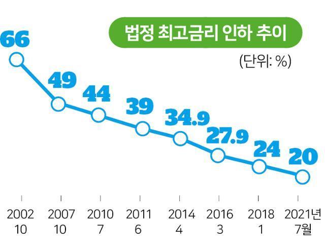 금융당국이 20%까지 낮아진 법정 최고금리를 최대 27.9%까지 올리는 방안을 검토하고 있다. 서민의 이자 부담을 줄이기 위해 실시했던 법정 최고금리 인하가 최근 되레 서민의 돈줄을 막는 주요 문턱으로 작용하고 있기 때문이다.