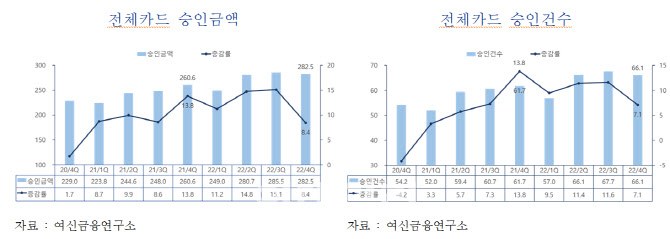 지난해 4분기 전체 카드 승인금액 및 승긴건수는 각각 282조5000억원, 66억1000건으로으로 지난해 같은 기간 대비 8.4%, 7.1% 증가했다.