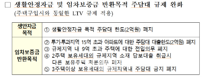 현재 투기·투기과열지역내 15억원 초과 아파트의 경우 보증금 반환 대출을 받으면 2억원이 대출 한도인데 이를 없애고 담보인정비율(LTV)한도를 적용한다.