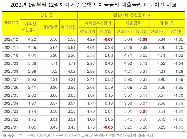 특히 12월 대출금리 하락은 수신금리 하락세 0.07%p를 앞지르는 이상현상을 보였다. 같은 기간 저축성 수신금리는 04.29%에서 4.22%로 떨어졌다.