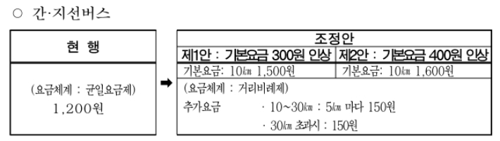 광역버스의 경우도 현행 2300원인 균일요금이 30km 기본요금 3천원에 매 5km마다 150원이 추가되는 거리비례제로 바뀐다.