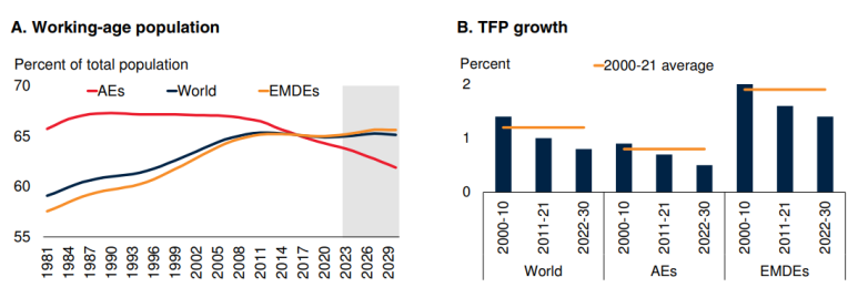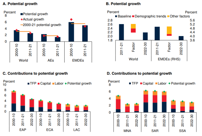 2011-21년부터 2022-30년까지 연평균 2.2%로 2000년(5% 감소) 이후 가장 낮은 속도. 둔화의 약 절반은 생산가능인구의 성장 둔화와 노동력 참여 감소 등 고령화로 인한 인구통계학적 요인 때문. EMDE 잠재 성장률은 2022-30년에 연평균 4.0%로 매년 1.0%포인트씩 둔화될 것으로 예상. 이러한 감소는 전 세계적으로 확산될 것: 대부분의 EMDE를 포함하여 세계 GDP의 거의 80%를 차지하는 경제는 2011-21년과 2022-30년 사이에 잠재적 성장 둔화를 경험할 것으로 예상. 무역을 포함한 모든 전통적인 성장 동력은 향후 10년 동안 약화될 것으로 예상. 그러나 서비스 부문에서는 비교적 건전한 성장이 예상.