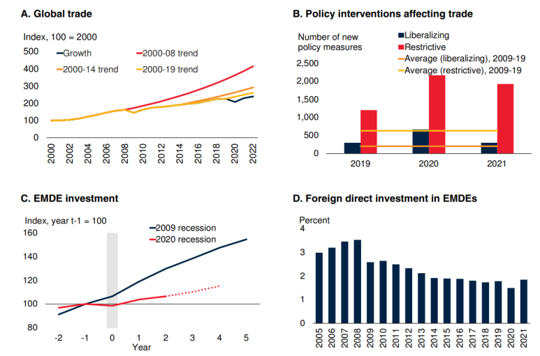 부분적 제한적인 무역 조치의 사용 증가로 인해 세계 무역 성장이 둔화되었다. EMDE로의 외국인 직접 투자 유입은 2000년대 초반부터 약화. 2020년 글로벌 경기 침체에서 EMDE 투자의 회복은 2009년 글로벌 경기 침체 이후보다 덜 견고할 것으로 예상.