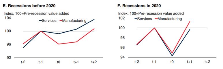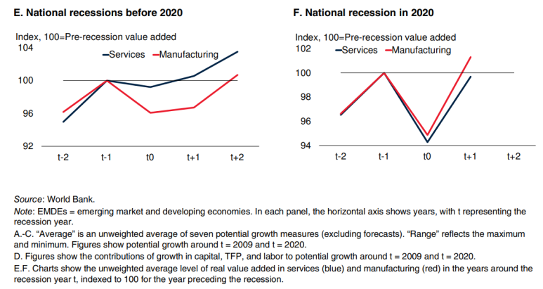 잠재 성장률은 2009년과 2020년의 글로벌 경기 침체 동안 투자 증가, 노동력 증가 및 TFP 성장의 감소를 반영하여 하락. 2020년의 COVID-19로 인한 글로벌 경기 침체에서 특히 감소가 심했는데, 이는 서비스 활동의 불균형적 큰 손실로 이례적.