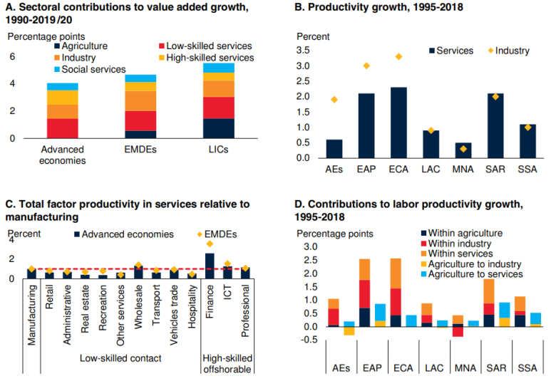 서비스 부문은 1995-2018년 선진 경제 및 EMDE 모두에서 GDP 및 고용 성장의 절반 이상을 차지. 서비스에는 정보 통신 기술과 같은 고숙련 오프쇼어 서비스와 소매 및 접객과 같은 저숙련 컨택 서비스가 모두 포함. 1995-2018년 동안 EMDE의 노동 생산성 증가는 부문 간 이동보다는 부문 내 개선에 의한 것. 2020년의 대유행으로 인한 경기 침체는 서비스 활동에 발생한 혼란으로 이례적이었다.