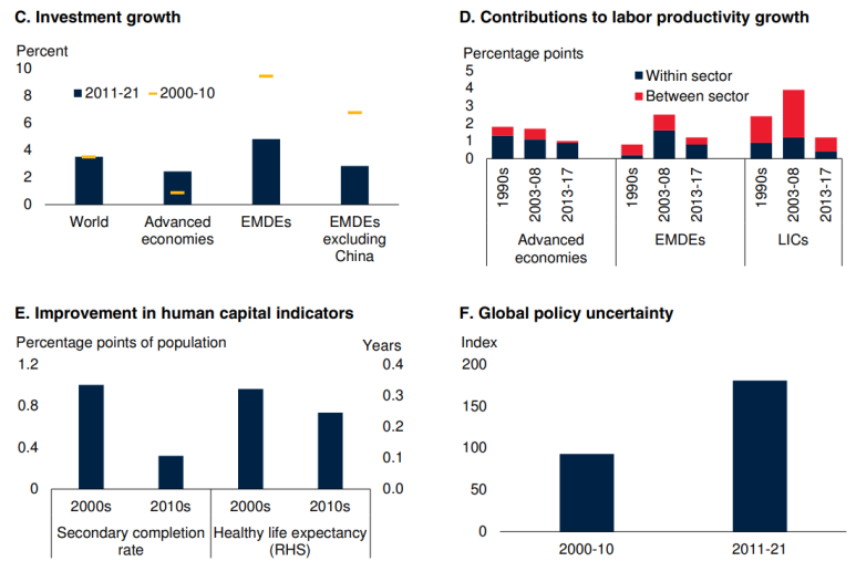 덜 생산적인 기업과 부문에 대한 요소 재배치도 느려졌다. 교육 및 의료 시스템의 개선으로 인해 더 나은 교육 및 건강에서 얻는 이득이 사라다. 전염병 이전에 10년간 약세를 이어온 EMDE 투자 증가율은 2022-24년 연평균 3.5%로 2000-21년 평균의 절반 수준에 이를 것으로 예상.