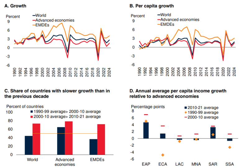 이러한 유형의 사건이 잠재 성장에 대한 지속적인 피해로 이어지기 때문에 주요 경제에서 금융 위기가 발생하고 다른 국가로 확산된다면 둔화는 훨씬 더 뚜렷해질 수 있다. 장기 성장 전망의 지속적이고 광범위한 감소는 신흥 시장 및 개발 도상국(EMDE)이 빈곤과 싸우고 기후 변화를 해결하며 다른 주요 개발 목표를 충족할 수 있는 능력을 위태롭게 한다. 이러한 과제는 국가 및 글로벌 차원에서 야심찬 정책 대응을 요구한다.