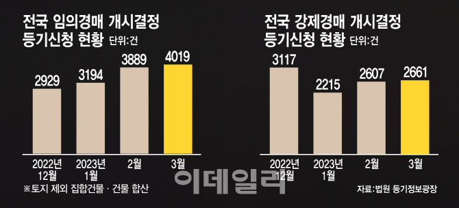 임의경매 개시결정 신청건수는 지난해 12월 2929건에서 올해 1월 3194건으로 3000건을 넘더니 2월 3889건, 3월 4019건으로 4000건을 넘기며 가파른 증가세를 나타내고 있다. 임의경매는 재판 없이 저당권을 근거로 경매를 신청하는 절차다. 은행이 담보권을 근거로 진행하는 것이 일반적이다.