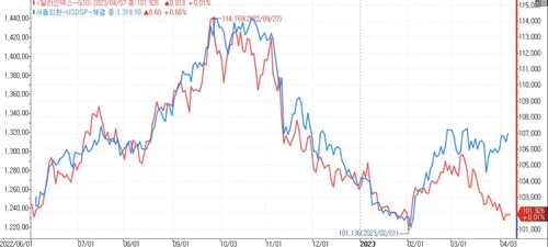 7일 서울외환시장에 따르면 달러-원 환율은 지난 3월 말을 기점으로 최근까지 상승을 거듭하고 있는 반면 달러 지수는 하락 추세다.