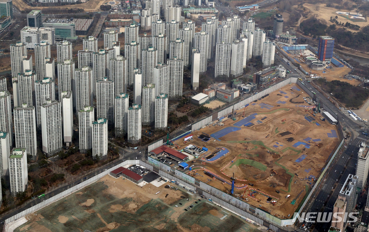 [서울=뉴시스] 김병문 기자 = 지난해 3월10일 오후 서울 송파구 롯데월드타워 서울스카이에서 진주·미성·크로바 아파트 재건축 현장이 보이고 있다. 2022.03.10. dadazon@newsis.com