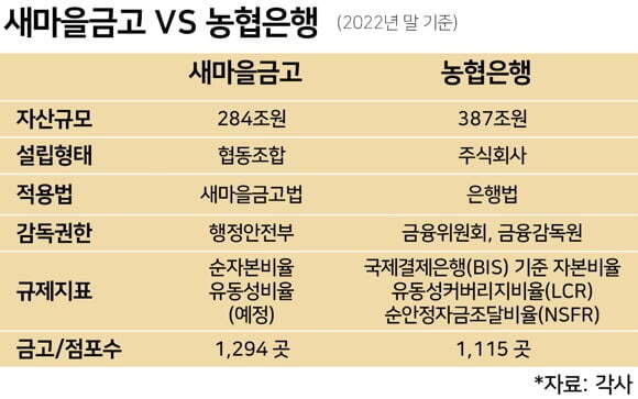 감독 체제에선 큰 차이가 벌어진다. 농협은 금융위원회 감독을 받는다. 예금이나 대출 업무와 관련해선 매달 금융감독원에도 업무보고서를 제출하고, 국제결제은행(BIS) 기준 자본비율과 바젤Ⅲ 기준 유동성지표인 유동성커버리지비율(LCR), 유동성비율(NSFR) 등으로 규제를 받는다. 반면 새마을금고는 행정안전부 감독을 받는다. 금감원은 직접 들여다볼 권한이 없다. 여·수신 현황은 물론 경영지표조차 알기 어렵다. 건전성 감독 수준은 초보적인 수준이다.