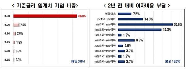 전국경제인연합회(이하 전경련)가 24일 시장조사 전문기관인 모노리서치에 의뢰해 매출 1000대 제조기업을 대상(107개 사 응답)으로 '자금사정 현황'을 조사한 결과, 응답 기업의 대부분인 86.0%는 영업이익으로 이자비용을 감당할 수 있는 기준금리 임계치를 현재의 기준금리 수준인 3.50%라고 꼽았다.