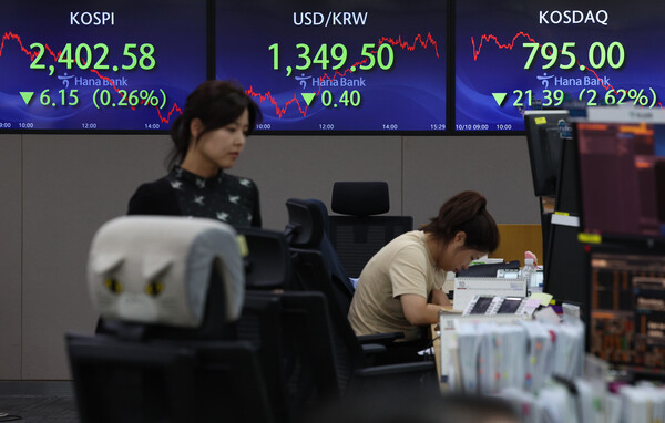 10일 오후 서울 중구 하나은행 딜링룸 전광판에 코스피 지수가 표시돼있다. 이날 코스피 종가는 전장보다 6.15포인트(0.26%) 내린 2,402.58로, 코스닥지수는 전장보다 21.39포인트(2.62%) 떨어진 795.00으로 마감했다. /연합