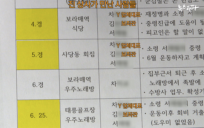 그런데 뉴스타파가 입수한 심리전단 진 모 상사의 소명 자료를 보면 진 상사와 Y업체 대표 차 씨, 김 보좌관 등 3명이 대북확성기 낙찰 직후인 2016년 4월부터 6월까지 3차례에 걸쳐 만난 것으로 확인된다. 언론을 통해 대북확성기 입찰 비리 의혹이 제기될 시점이다.