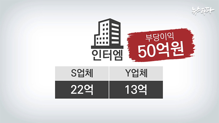 감사원 감사결과 하청업체 2곳(S업체 22억, Y업체 13억)이 35억 원의 부당이익을 챙긴 것으로 드러났으니 인터엠이 챙긴 부당이익은 50억 원으로 추정된다.